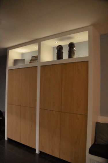 Wij maken maatwerk meubels en daarbinnen ook inbouwkasten. Hierbij kijken wij samen met jullie naar jullie wensen, de ruimte waar de kast geplaatst gaat worden en welke functionaliteit er nodig is. Hierbij moet je denken aan open vakken, lades, deurtjes, een tv vlak en bijbehorende aansluitingen. Ook verlichting en extra stroompunten verwerkt in de kast komen aan bod. Wij denken vanuit onze jarenlange ervaring met je mee en adviseren je daarbij zodat je, jullie, de beste oplossing krijgen bij de inbouwkast op maat.