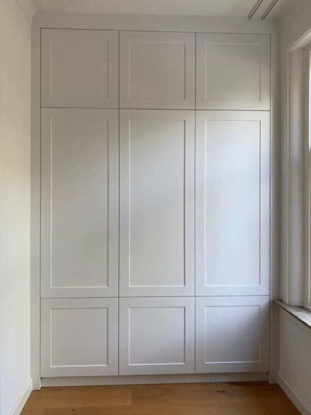 Omdat de kast erg hoog moest worden en er bovendien een ronding én een plafond- en muurplint aanwezig waren, zijn we alles ter plaatse nog gaan bekijken en exact gaan inmeten. Er is meteen een mal gemaakt waardoor de afwerking tussen de kast en het plafond echt exact aansluit. Ook de plintmaat is exact uitgewerkt. Zeg nu zelf: dat ziet er toch wel echt super mooi en strak uit?!