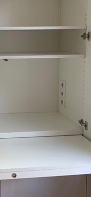 Tijdens het inmeten zagen we dat er een muurstopcontact in de rechtermuur aanwezig was. Ons voorstel om dit stopcontact op de binnenwand van de kast te plaatsen bij het bureau werd meteen enthousiast door Bart ontvangen. We freesden een gat in de binnenwand van de kast waarin exact een inbouwdoos met stopcontact past. Hierdoor is werken op een laptop of het plaatsen van een bureaulampje altijd mogelijk en heb je dus geen last van stroomdraden die voor de kast(deur) hangen.