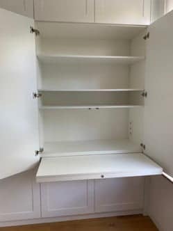 Een ander voorstel van mij was om in het brede deel een uitschuifbaar werkblad te creëren. We hebben een gaatje gefreesd in de voorzijde van het blad. Door je vinger hier in te steken is het blad wat makkelijker hanteerbaar. Doordat het blad uitschuifbaar is kan het ook gewoon weer dichtgeschoven worden en de kastdeuren gesloten worden als het niet meer gebruikt wordt: opgeruimd staat netjes! Door speciale scharnieren te gebruiken kunnen de deuren verder worden opengezet wat weer voor extra ruimte zorgt als je aan het bureau zit.
