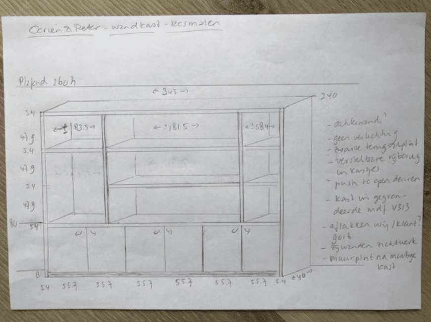 Vaak denken klanten dat als je een maat, plaatje en kleur doorgeeft dat alles er dan ook zo uit komt te zien en of er een prijs gemaakt kan worden. Dat is bij maatwerk meubels niet het geval. Vaak heb ik nog zeker minimaal zo’n tien vragen die invloed kunnen hebben op de uitvoering en dus ook op de prijs.