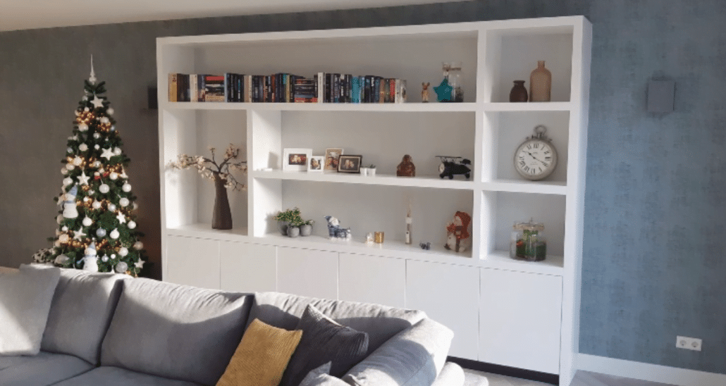 De muur in dit huis was mooi strak. Mijn advies was ook om daar waar de wandkast zou komen te staan de muur met een witte muurverf te behandelen. Hierdoor hoefde geen achterwand gemaakt en gemonteerd te worden wat ook weer kostenbesparend werkte.