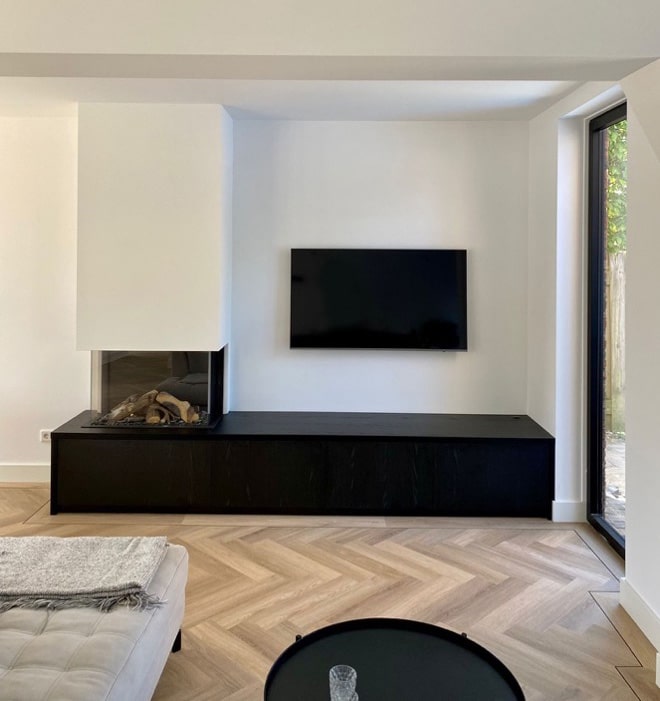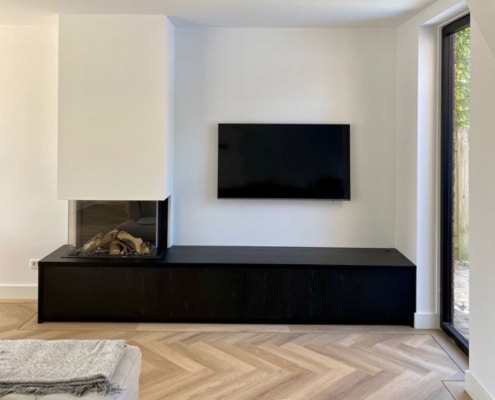 Toegeven, wij zijn geen haardspecialist en adviseren onze klanten altijd de haard bij een erkende haardleverancier aan te schaffen. Wat wij als interieurbouwer wel kunnen, is deze haard helemaal exact inbouwen in jouw maatwerk meubel. Een schouw boven je haard maakt het plaatje natuurlijk helemaal af. Voor Christa, de bewoonster van dit huis in Den Bosch is dat dan ook precies wat wij hebben mogen realiseren. Stijlvol afgemaakt met een strak, zwart tv-meubel. Het meubel biedt een hoop opbergruimte en zorgt voor een mooie industriële look in combinatie met de schitterende visgraat vloer. Wil jij ook zo’n sfeervol ingebouwde haard? Neem dan even contact met ons op. We komen graag ook bij jou langs om een mooie ombouw op maat voor je te maken en monteren.