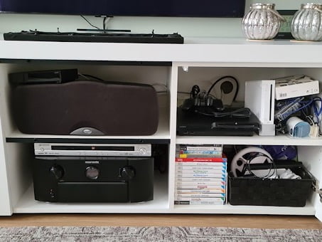 Robin houdt van muziek en computerspellen waardoor er veel apparatuur, met bijbehorende kabels en stekkers, mooi weggewerkt moest kunnen worden in het meubel. En deze kabels moet je natuurlijk wegwerken. De afmetingen van het TV meubel stemden we dan ook af op de hoogte/breedte- en dieptemaat (inclusief stekkers) van de apparatuur.