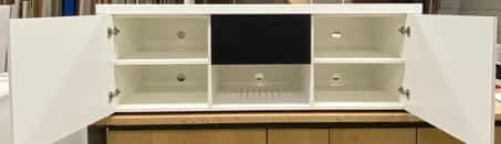 - De klanten wilden het TV meubel met ventilatie graag in dezelfde wit kleur als de kozijnen, namelijk RAL 9016. We hebben het meubel dan ook afgelakt met deze kleur op waterbasis in een hoogwaardige lakverf.