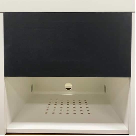 Robin is heel blij met de grote speaker en wilde deze graag in het zicht op of in het meubel voor een optimaal geluidsresultaat, maar zijn vriendin werd van dat idee niet blij. We maakten daarom een afneembaar front met zwart speakerdoek (ook in andere kleuren leverbaar). Een mooie oplossing om beide partijen tegemoet te komen. Als Robin toch de speaker een keer wilt zien tijdens een avondje muziek draaien, dan kan hij het afneembare front gewoon makkelijk verwijderen!