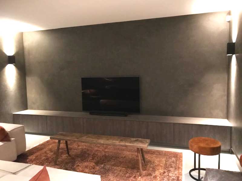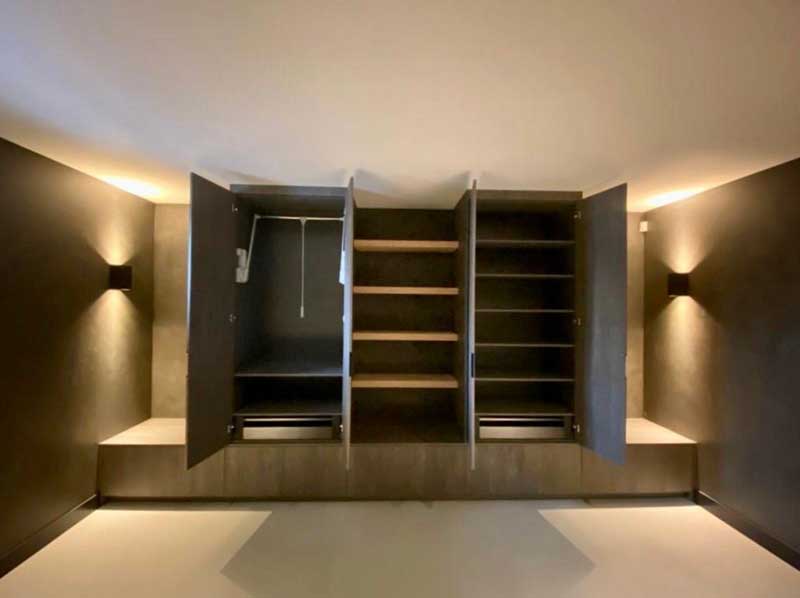 Een jaar geleden hebben wij op verzoek een 5 meter breed TV-meubel op maat gemaakt en geplaatst. Onlangs heeft de ruimte een andere functie gekregen, waardoor het TV-meubel onnodig werd. We dachten met de bewoners mee en kwamen tot een goede oplossing. We hebben van dit grote TV-meubel een functionele (kleding)kastenwand kunnen maken.