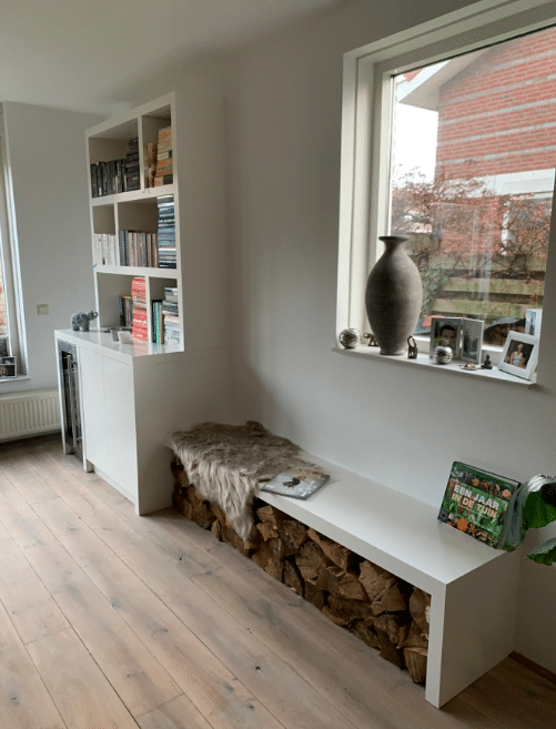 - Onder het bankje kan het haardhout opgeborgen worden wat meteen voor een gezellige en stoere uitstraling zorgt. Verder kan er natuurlijk op het bankje gezeten worden of gebruikt worden om accessoires uit te stallen.