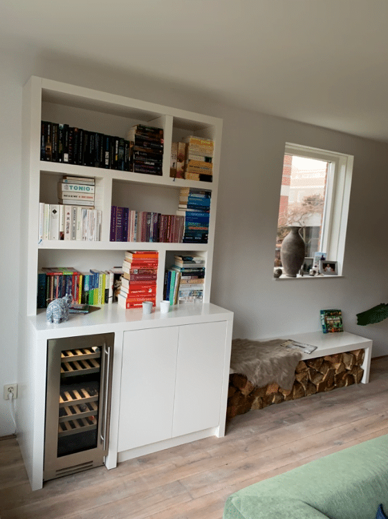 Marja en haar man hebben drie hobby’s: wijnen 🍷, boeken lezen 📚 en een vuurtje stoken 🔥 in de open haard. Mij werd gevraagd een ontwerp te maken voor een meubel waarin deze drie items zouden samenvallen.