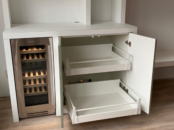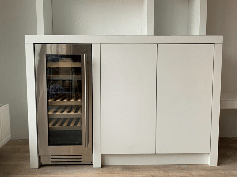 - De wijnkast is helemaal op maat ingebouwd, waardoor deze helemaal mooi in de kast valt. Zoals je kunt zien hebben we de vloerplint van de kast exact gelijk gemaakt met het onderste deel van de wijnkast.